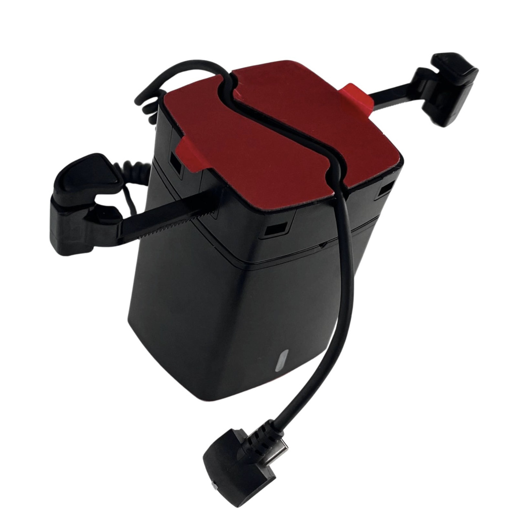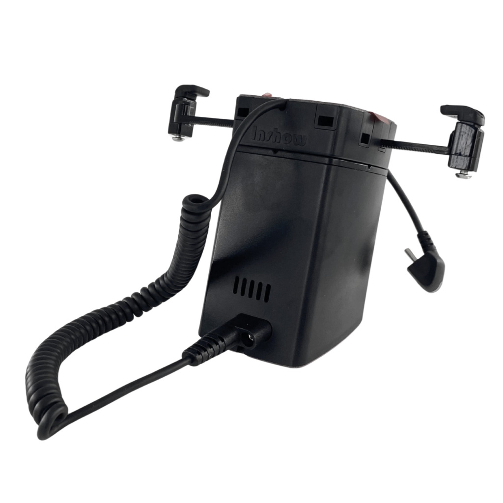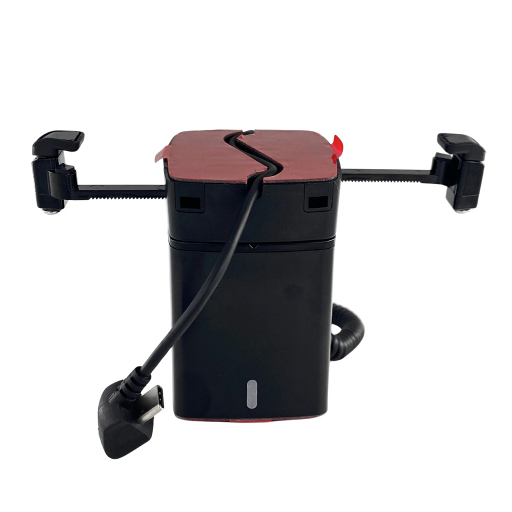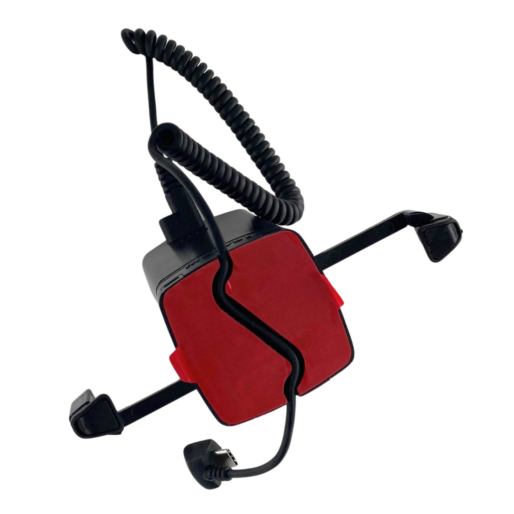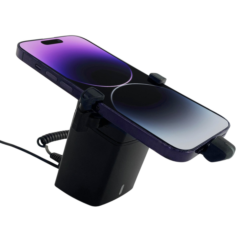 Sim, o celular exposto continua fixado e o alarme funcionando. O A110B possui bateria interna com autonomia para 3 horas.